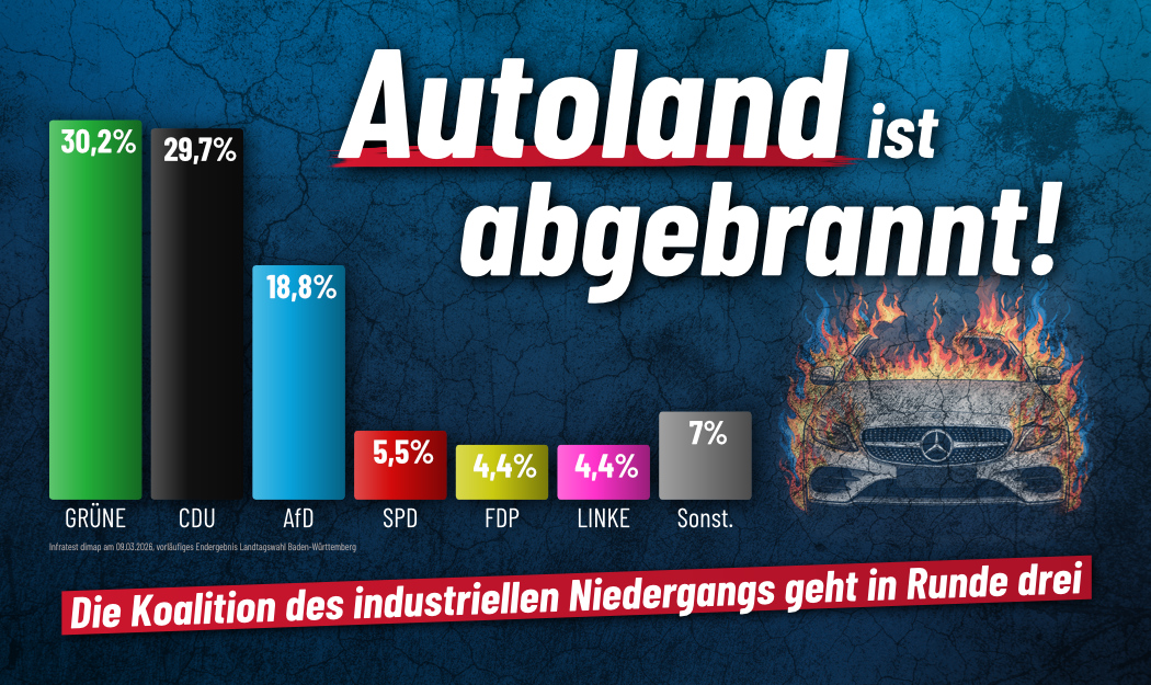 Deutschlands Autoland liegt bereits in Trümmern, doch Baden-Württemberg wählt trotzdem die Brandstifter erneut ans Steuer. Grün-Schwarz wird wohl weiterregieren, obwohl sich die AfD sensationell verdoppelt hat und daher gemeinsam mit der CDU die dringend notwendige Wende einleiten könnte. Aber dank antidemokratischer „Brandmauer“ dürfen dieselben Parteien, die unser einst starkes Industrieland in zehn Jahren völlig heruntergewirtschaftet haben, nun genauso weitermachen.